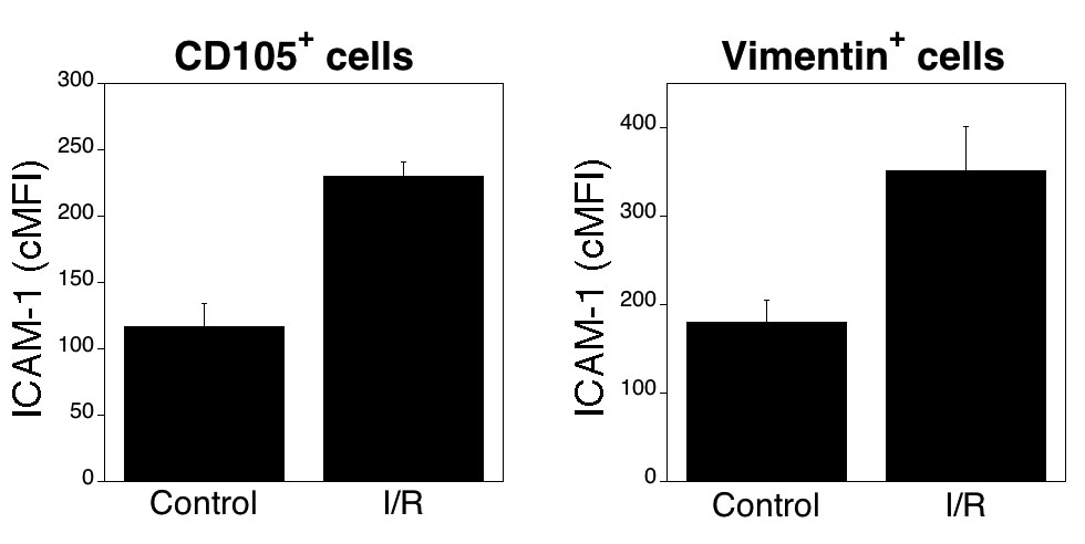 Figure 5. Upregulation of ICAM-1 on CD105+ and vimentin+ cells after ischemia or reperfusion. One eye from each mouse was subjected to ischemia- reperfusion (I-R). Nonischemic eyes