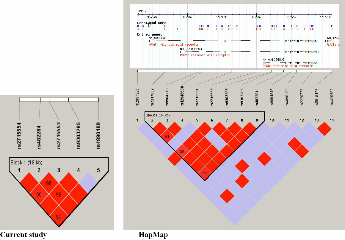 RARA gene. In the left hand panel is shown the LD block with r