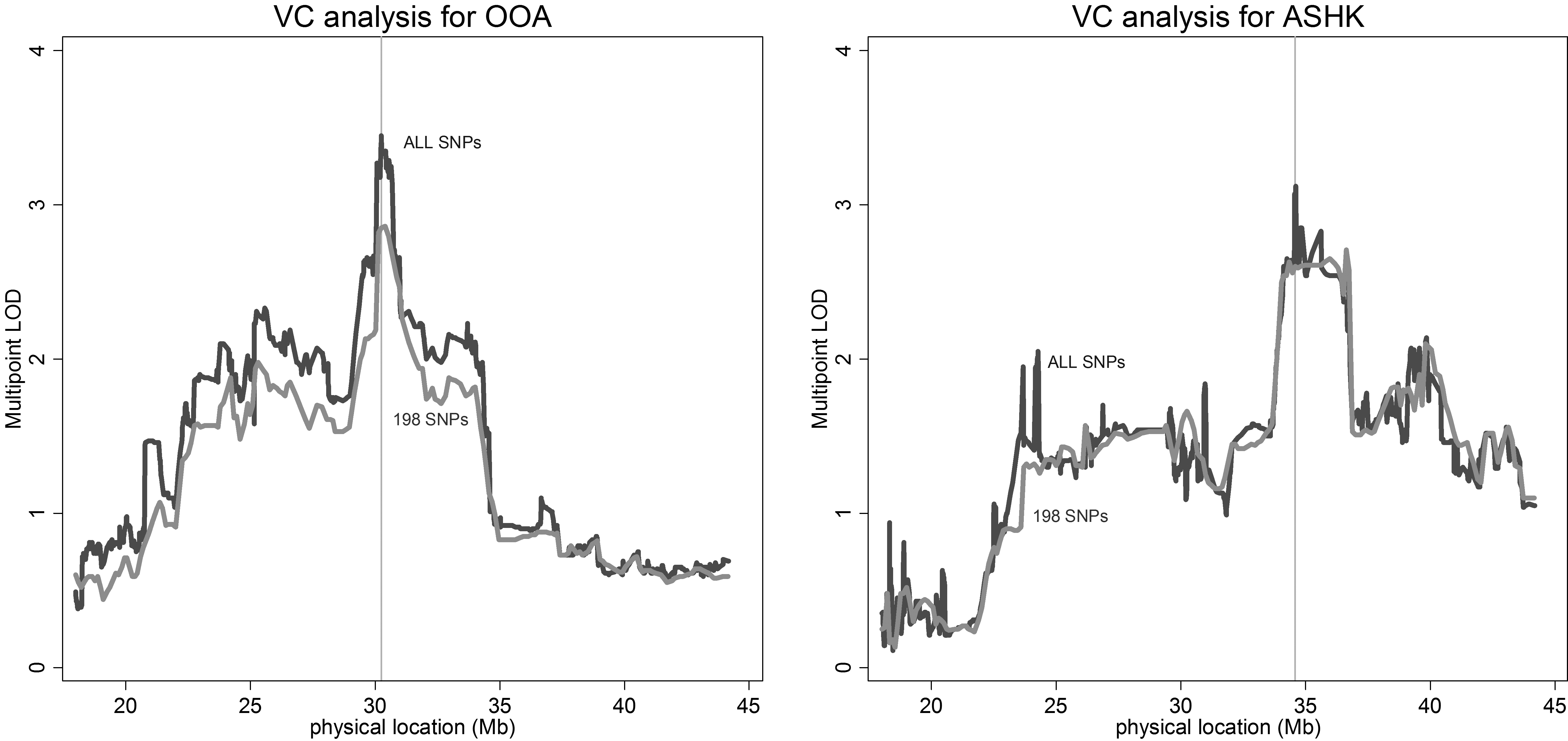 linkage LOD scores for OOA (left) and ASHK (right) for two different