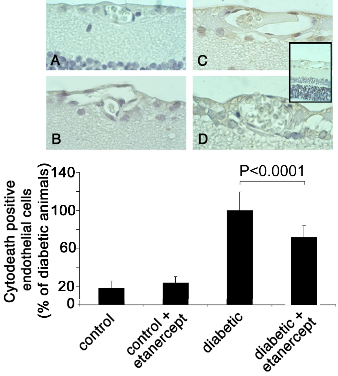 Figure 4. M30 CytoDeath staining of retinal sections. Paraffin sections of eyes from non-diabetic rats (A), non-diabetic rats treated with etanercept (B), diabetic rats (C), and diabetic rats treated with etanercept (D) were assessed with M30 staining. Sections were subsequently counterstained with hematoxylin. Insert shows an overview of