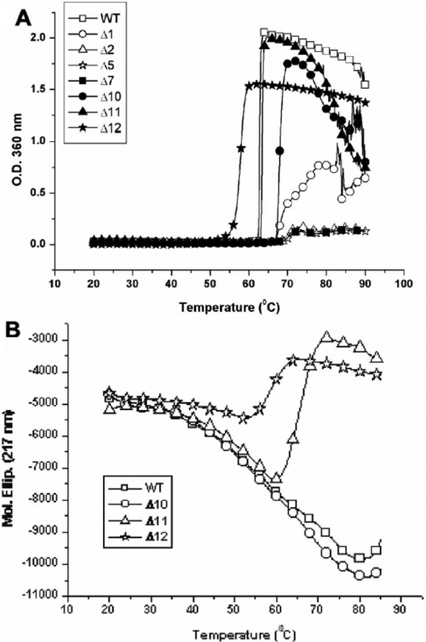 to 67 °C, which displays greater light scattering than Δ2, Δ5, and Δ7. Mutant Δ12 is least stable as compared to other mutants