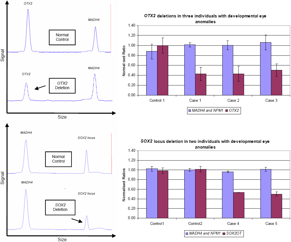 Figure 1. The use of MLGA to detect OTX2 and SOX2 deletions in cases 1-5. Left: GeneMapper® traces demonstrate the reduced signal from an OTX2 deletion (upper) and a SOX2 locus deletion (lower). Right: Bar graphs of normalized peak area ratios show reduced copy numbers of OTX2 (upper) and SOX2 locus (lower) in individuals with deletions when compared to normal controls. A normalized ratio of 0.5 indicates a deletion