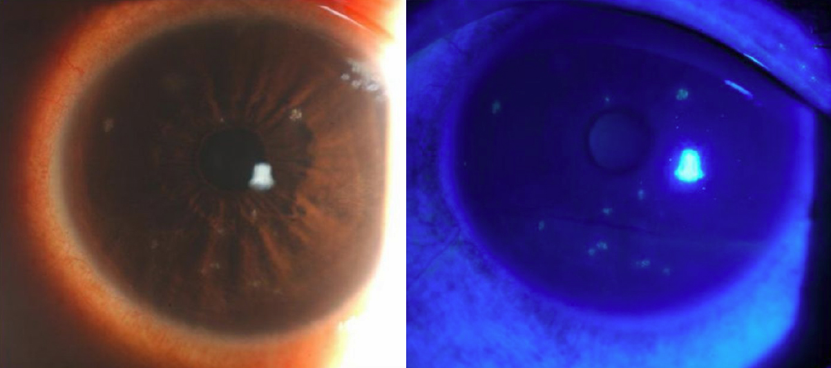 Representative photographs of the affected eyes with TSPK. In the left eye of patient #1, multiple coarse granular opacities stained with fluorescein are seen in the cornea.