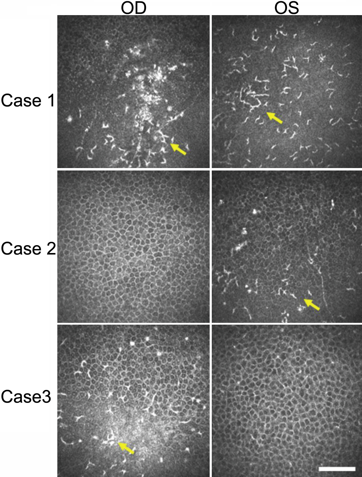 cells (arrow) were also evident in both eyes of patient #1, in the left eye (OS) of patient #2, and in the right eye (OD)
