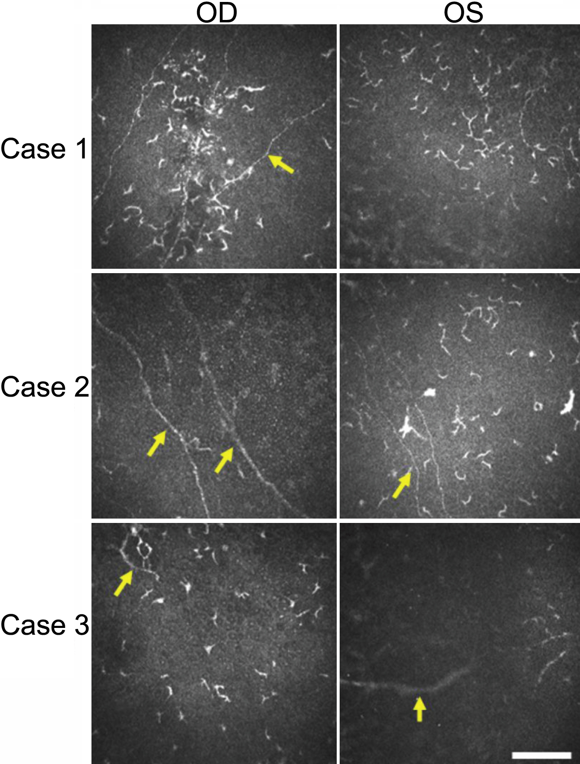 Figure 3. Representative HRTII-RCM images of the subepithelial nerve plexus of the cornea in three patients with TSPK. Aggregated dendritic