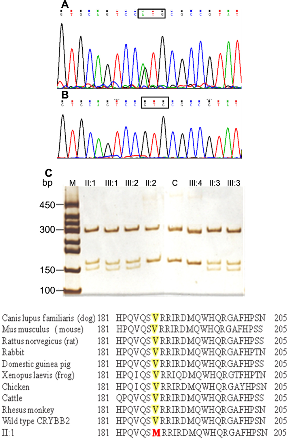 heterozygous with the V187M mutation (300, 168, and 150 bp) but not with unaffected individuals (300 and 168 bp). C demonstrates an unrelated healthy individual. D: Sequences producing specific alignment of CRYBB2 amino acids. A protein–protein BLAST search (NCBI) of human βB2-crystallin