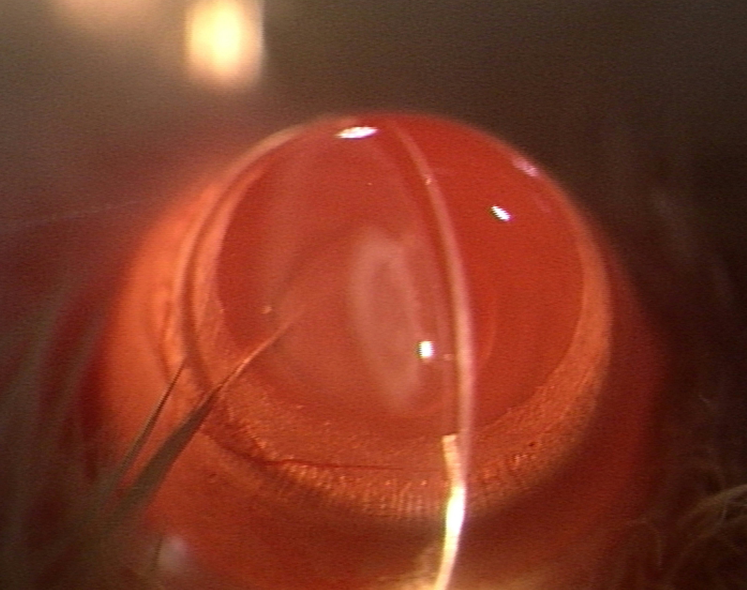 Slit-lamp appearance of the eye of 30-day-old Wistar rat pup in group III. This eye exhibited only slight opacification of the lens (Grade + opacification).