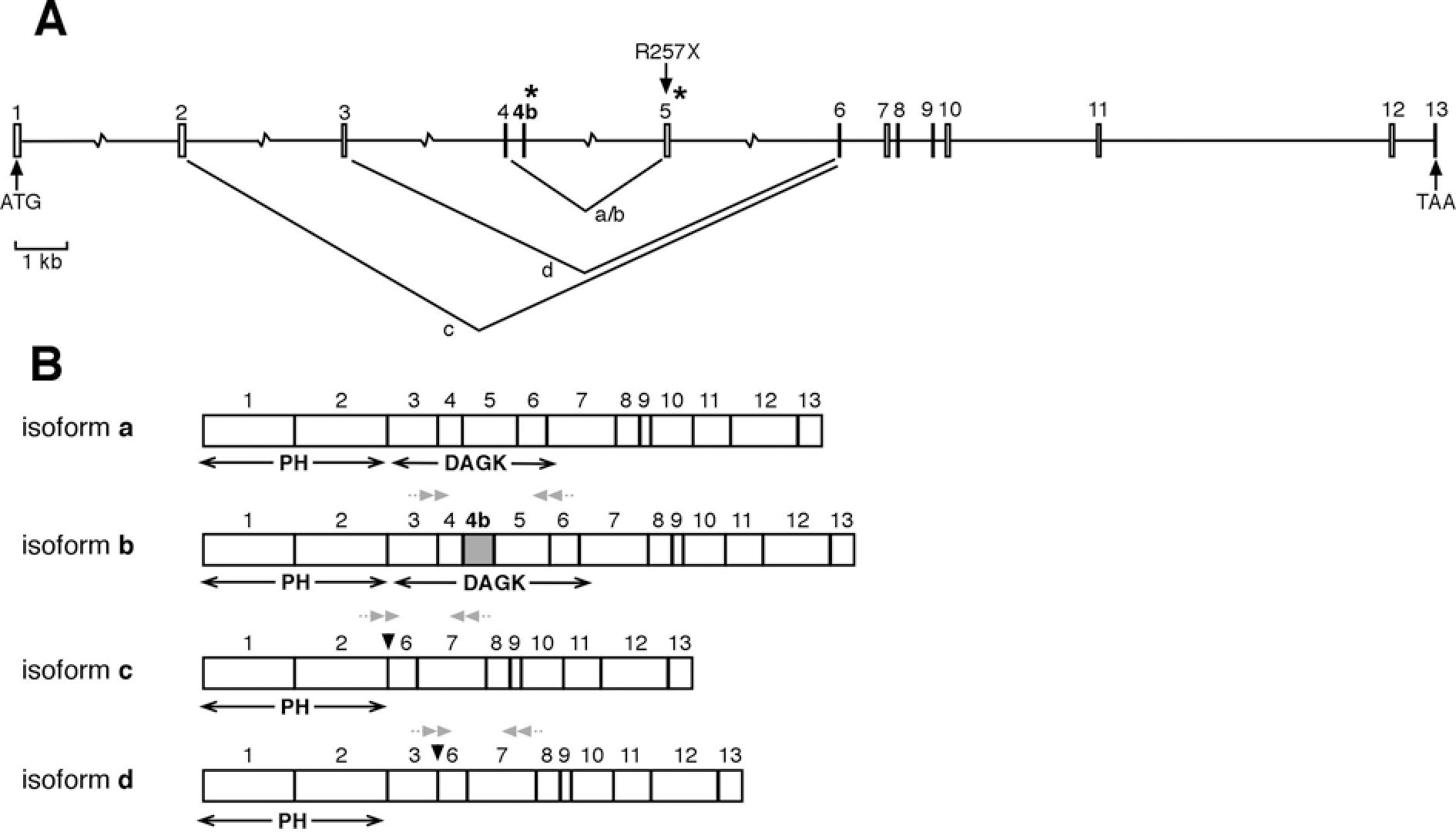 the DAG kinase domain, while isoforms c and d lack this domain. Grey
