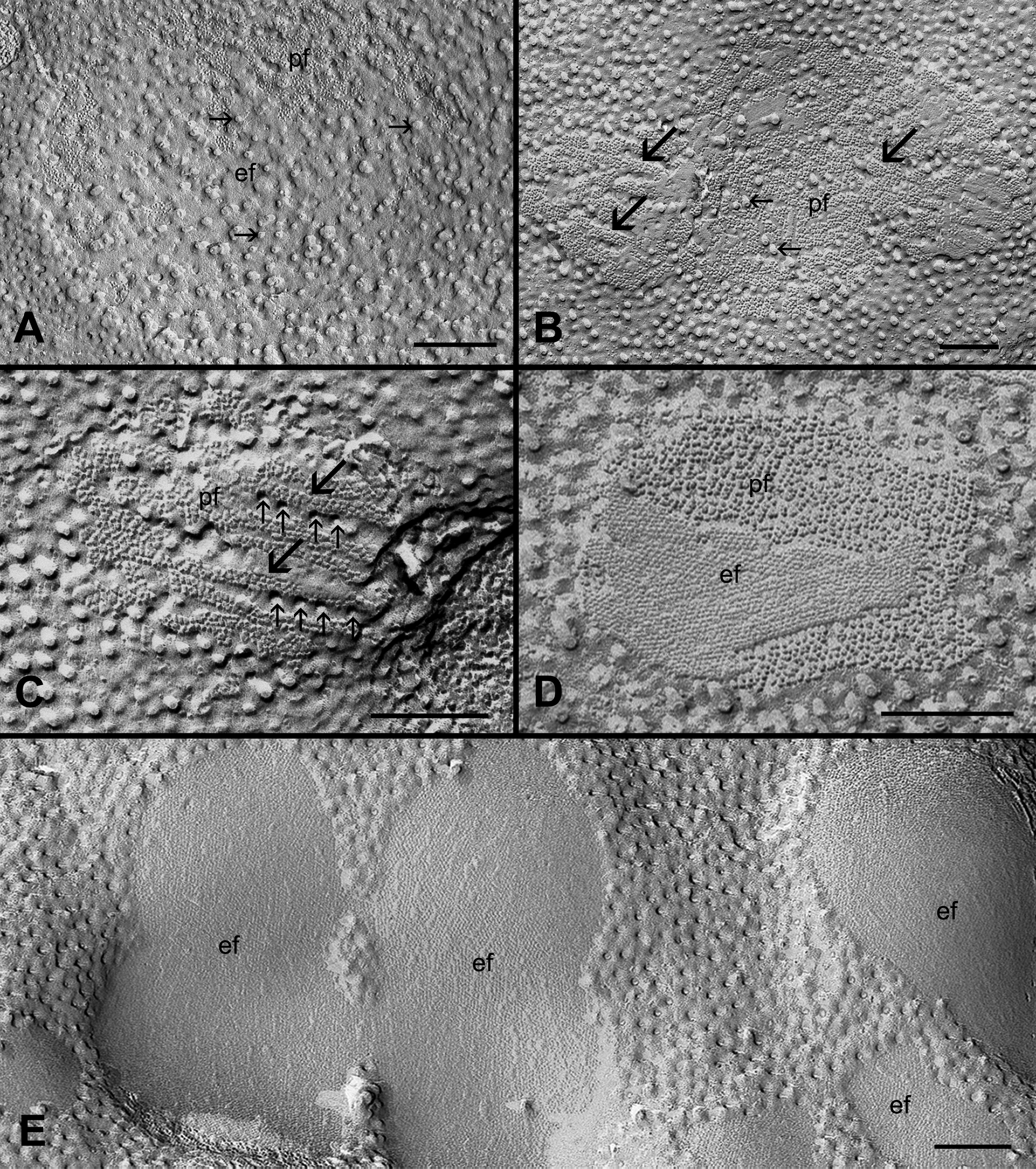 visualized more clearly on the E-face (ef) of the membrane. In the