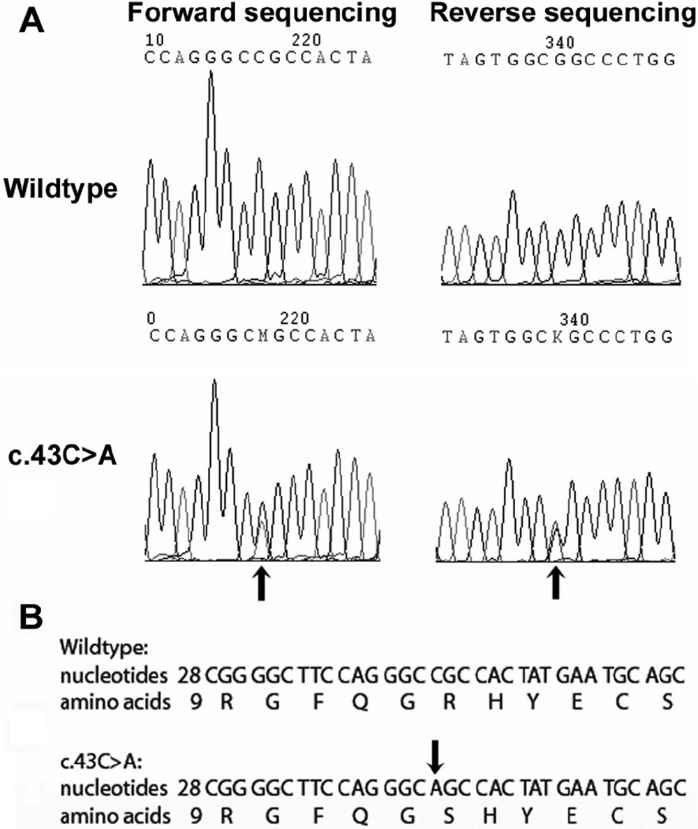 Figure 2. R15S mutation in Family A. A: The upper panel showed the forward (on the left) and the reverse (on the right) DNA segments of wildtype CRYGD. The lower panel displayed the forward and the reverse sequences of mutant CRYGD. The mutation of c.43C>A was indicated by arrow both in forward and reverse sequences. B: The DNA sequences in the upper lines and amino acid sequences in the lower lines were compared between wildtype and mutant