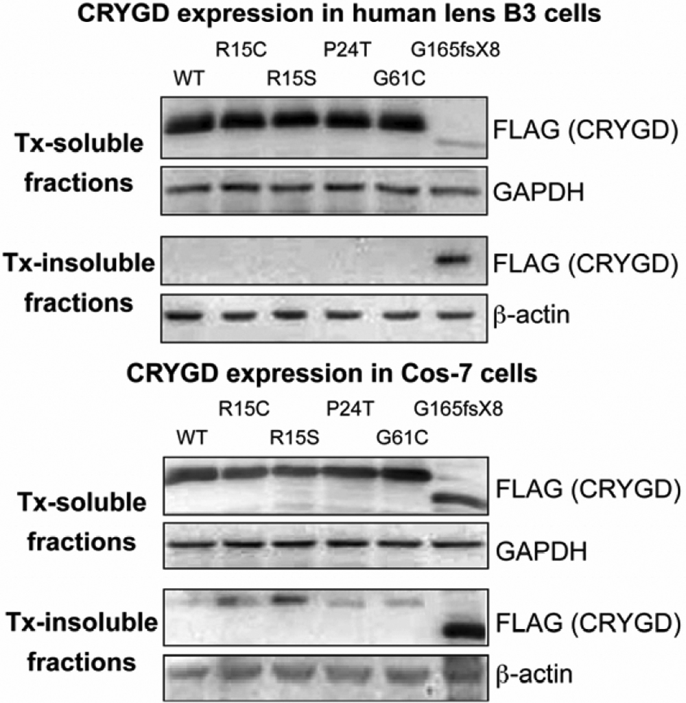 and all known mutant CRYGD (including R15S), except G165fsX8, were completely soluble in 0.5% Triton X-100 extraction. G165fsX8