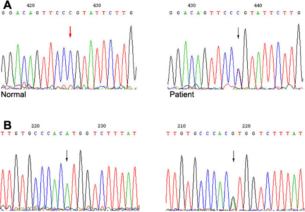is shown. Arrows indicate the sequence difference, and the one in red indicates the wild type sequence.