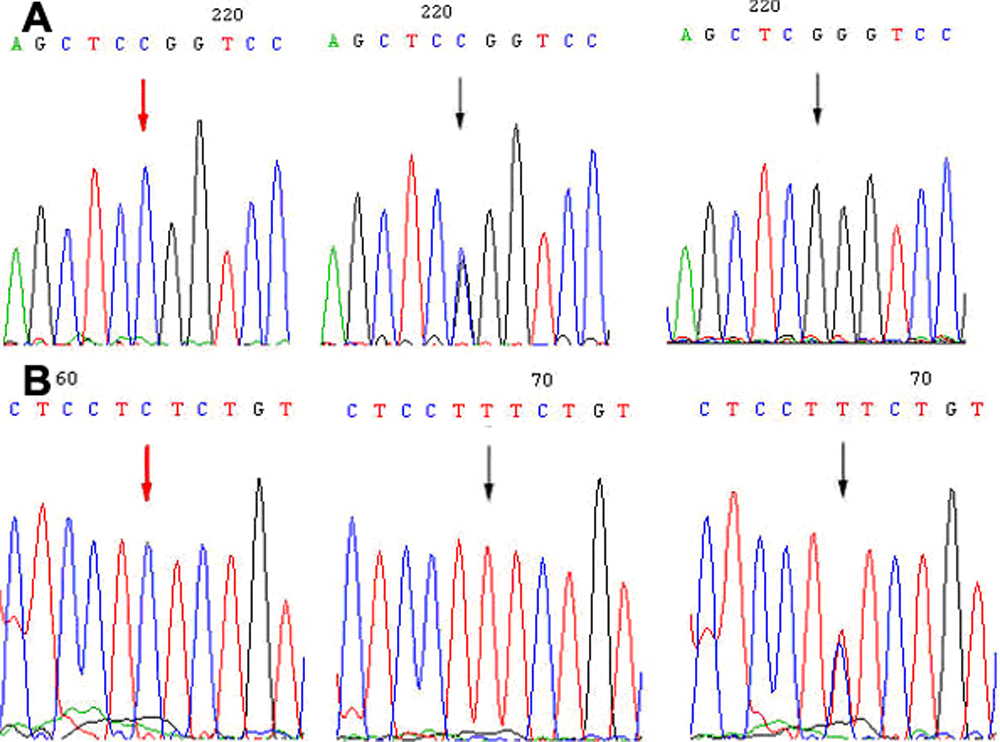 Figure 4. Two CYP1B1 SNPs in the glaucoma family. A: C>G variation in exon 2 of CYP1B1. The codon CGG in exon 2 was replaced by GGG, resulting in a change of amino acid from arginine to glycine (R48G). B: C>T variation in intron 1 of CYP1B1. These two SNPs occurred in all six patients afflicted with glaucoma, and were not found in asymptomatic family members except