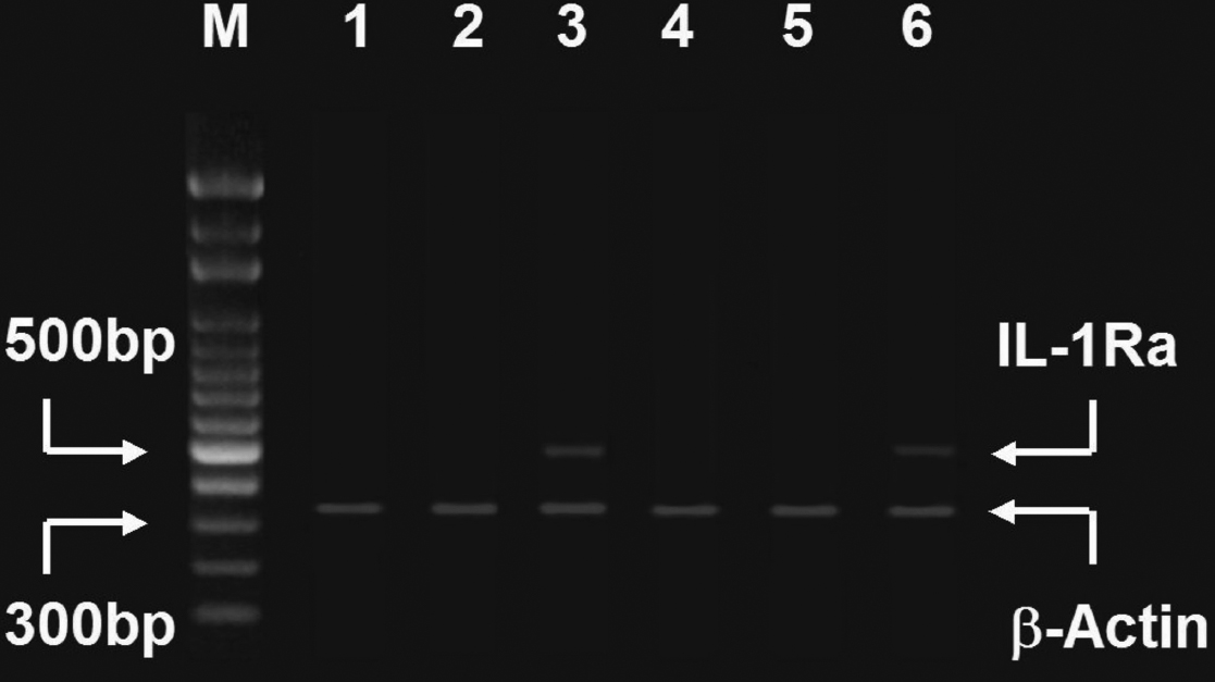 5) eyes. Significant transgene expression was still detected in the rAAV-IL-1Ra-injected eye (lane 6). Lane M shows the molecular