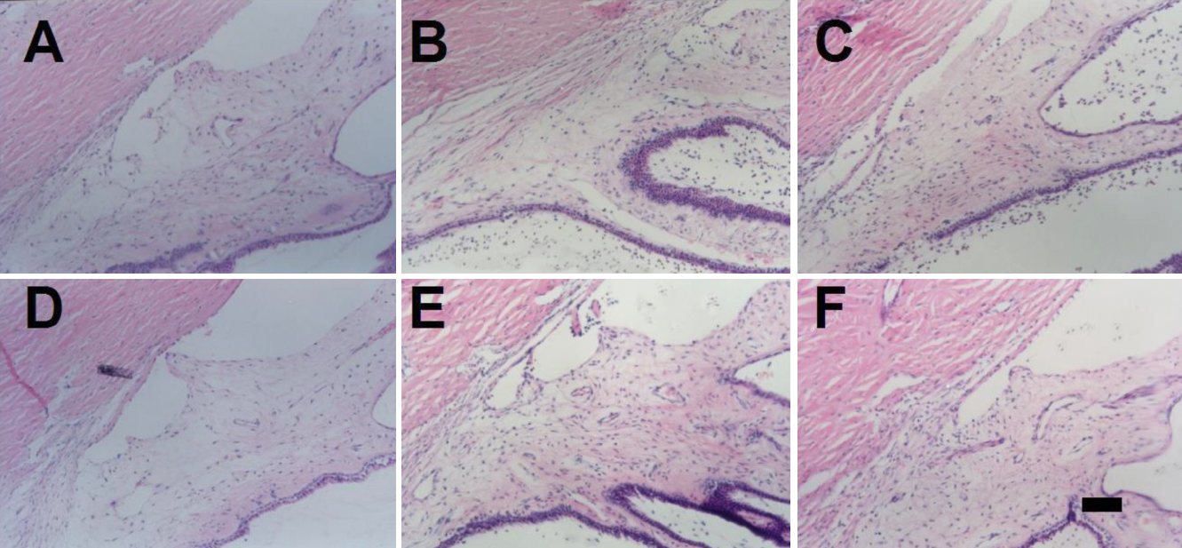 with H&E. Histology of eyes injected with rAAV-LacZ immediately before (A), one day after (B), and three days after (C) IL-1α injection. Histology of the eyes injected with rAAV-IL-1Ra immediately before (D), one day after (E), and three days after (F) IL-1α injection. The scale bar in F is equal to 100 μm.