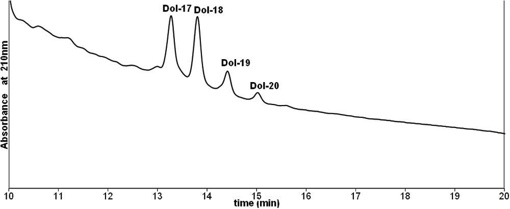 Figure 3. HPLC profile of total dolichol extracted from human lens with nuclear cataract. The peaks show the molecular species distribution