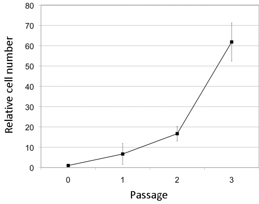 Growth of MCECs cultured in CnT-50. Each point is the mean of five individual experiments. The number of cells at confluency at each passage was counted and normalized to the number at P0. Error bar represents the standard deviations.