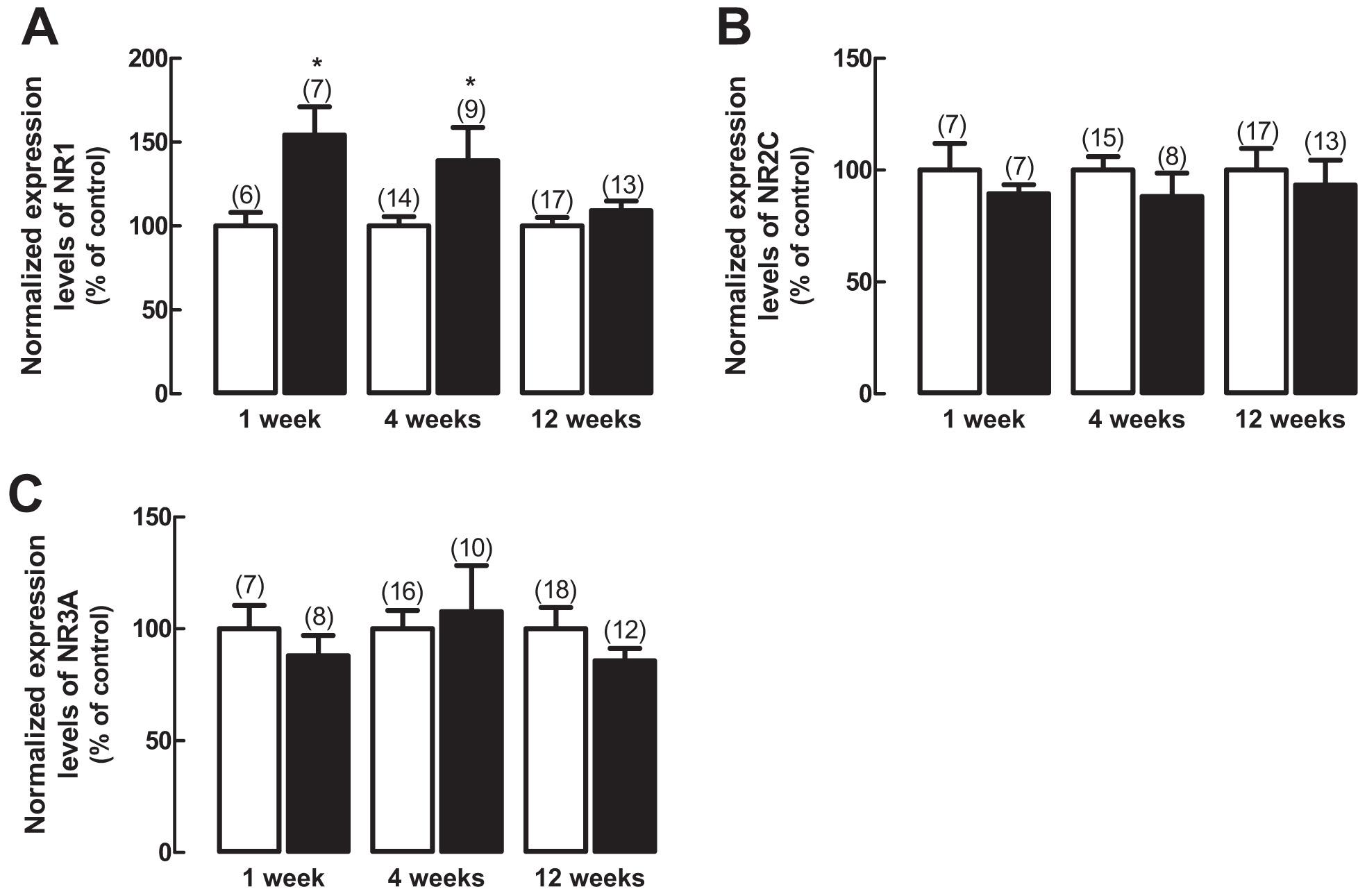 transcript levels of (A) NR1, (B) NR2C, and (C)