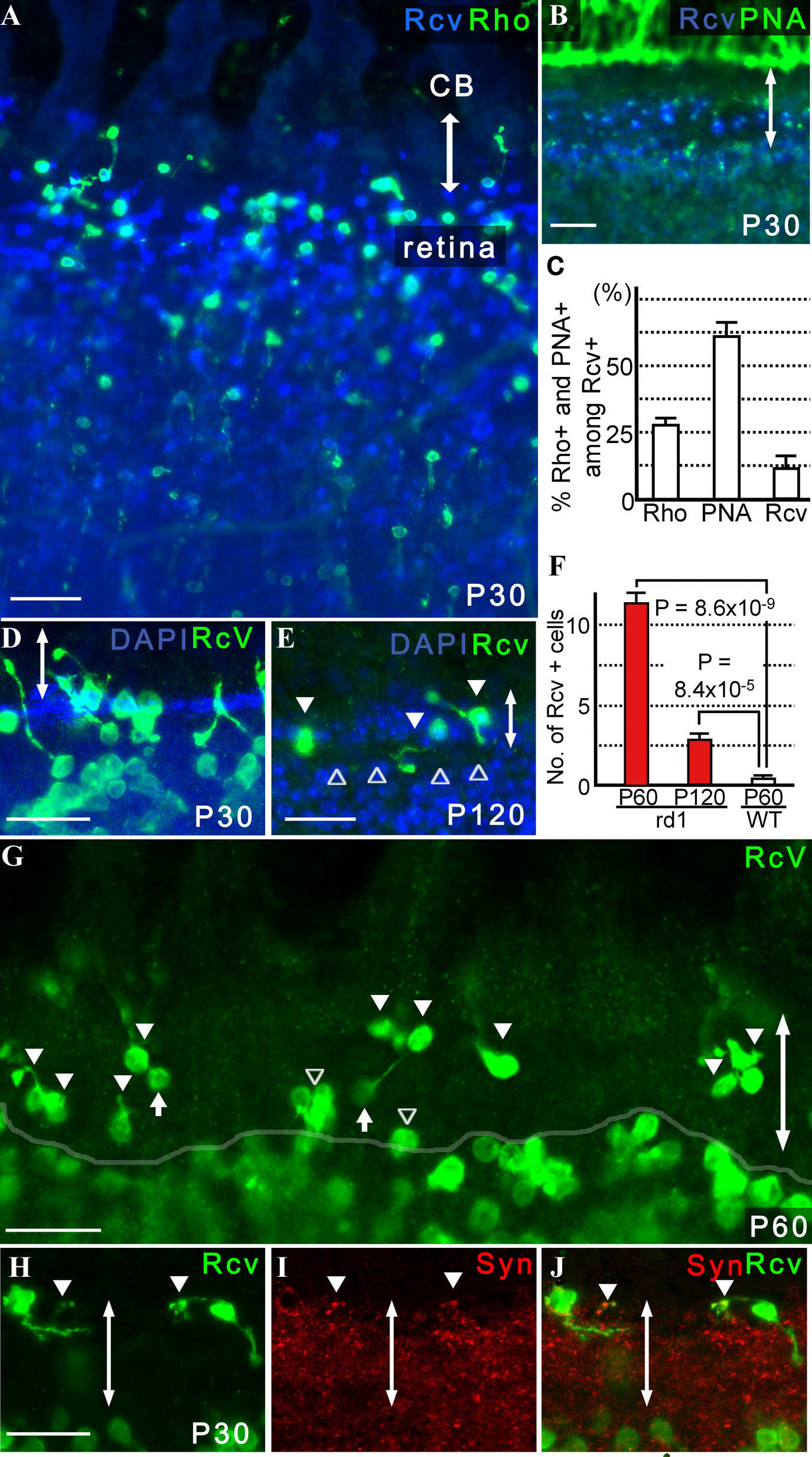 with DAPI staining. F: Increased numbers of recoverin-positive