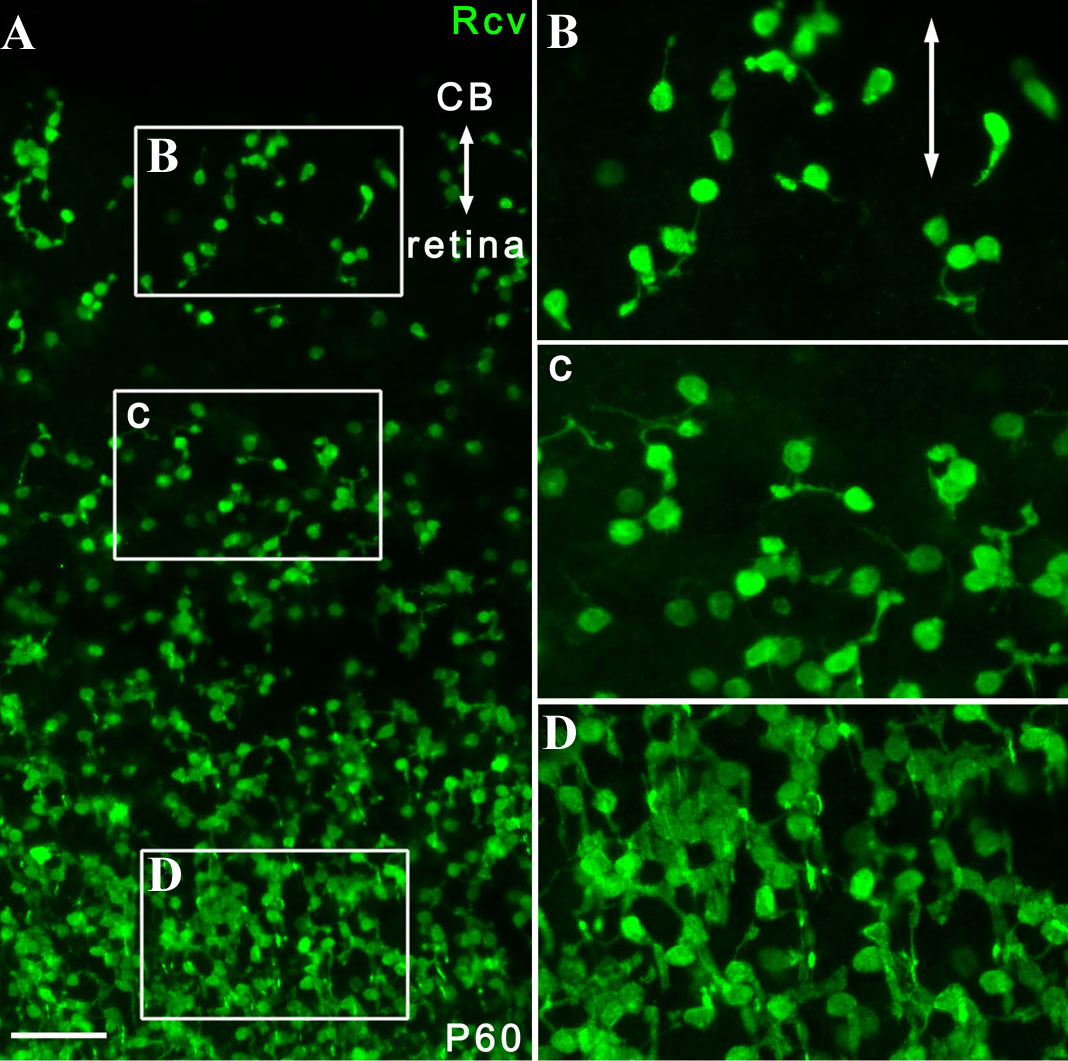 equals 50 μm. Abbreviations: ciliary body (CB); recoverin (Rcv).