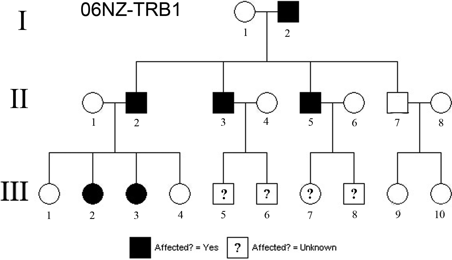 Pedigree of the reported family. Individuals III:5, III:6, III:7, and III:8 are younger than the average age of onset of symptoms, therefore affectation status can not be assigned.