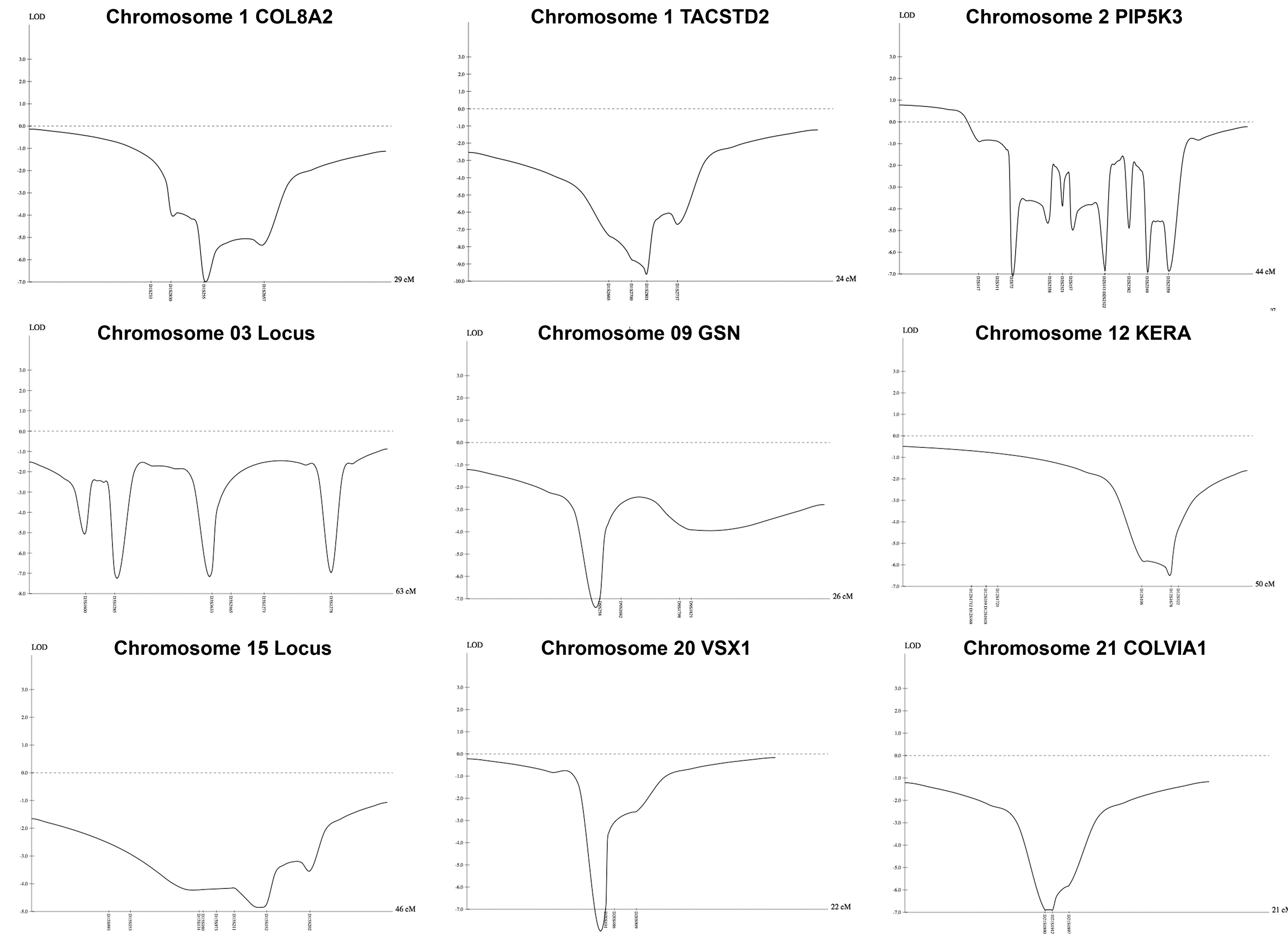 LOD plots. Multipoint linkage LOD plots of candidate genes and regions are demonstrated. All plots within the candidate interval fall below zero and have negative LOD scores.
