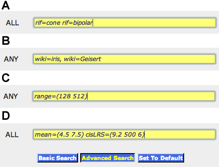 B will retrieve all probe sets that have been annotated by any user in the GeneWiki with either the word “iris” or the author’s