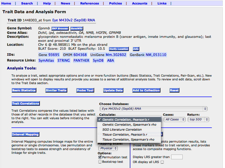 Trait Correlation' function finds the top data sets with matched expression patterns using complementary methods shown in the pull-down menu: