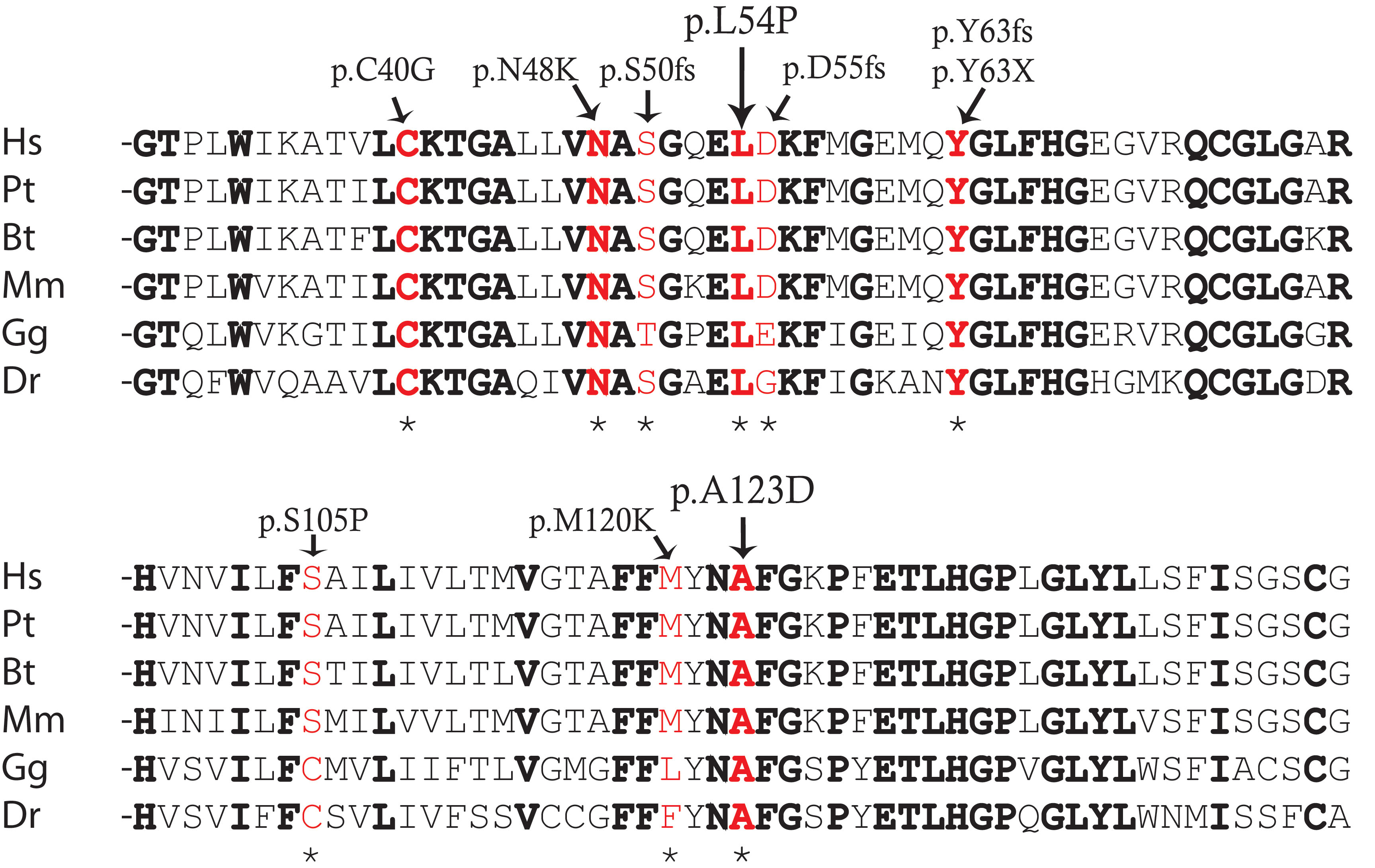 p.L54P and p.A123D changes. Amino acids conserved in evolution are