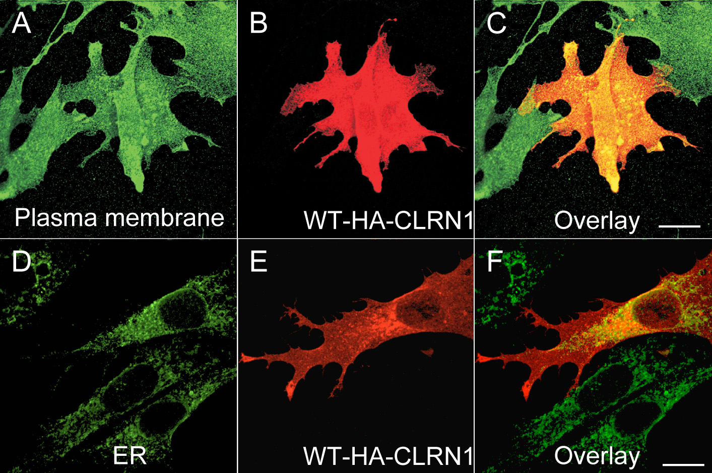 CLRN1-HA protein in transfected BHK-21 cells. In panels B and E