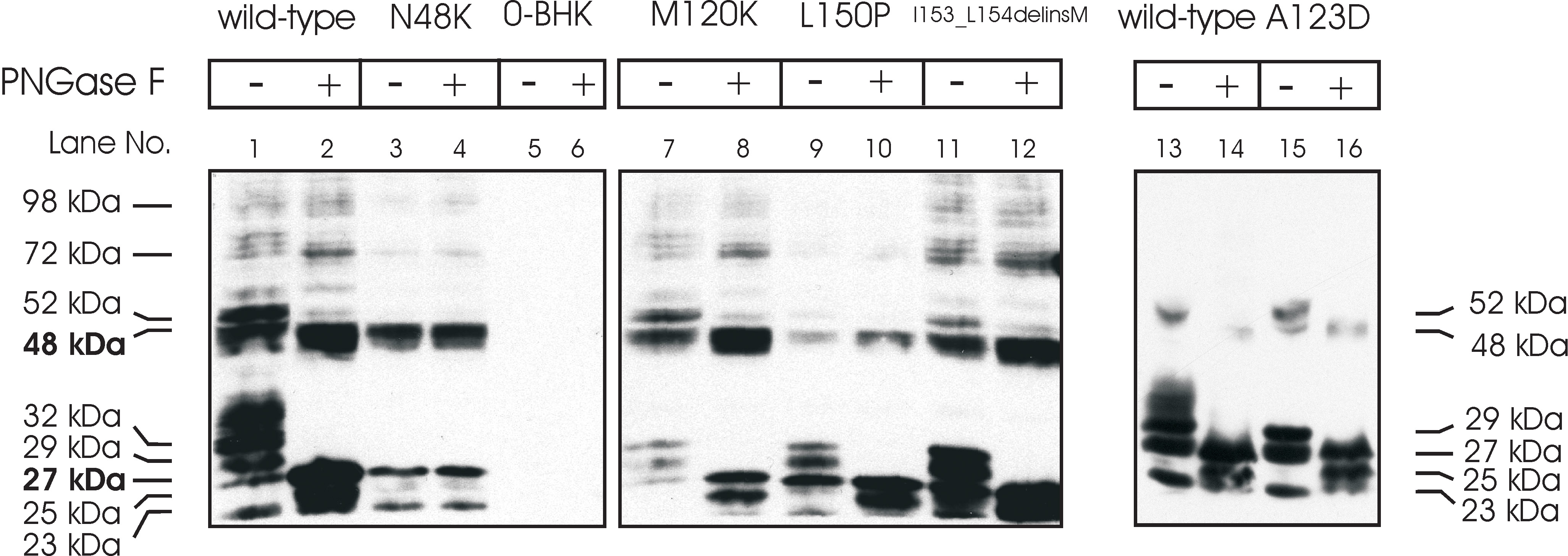 were untreated (-) or treated (+) with deglycosylating enzyme (PNGase