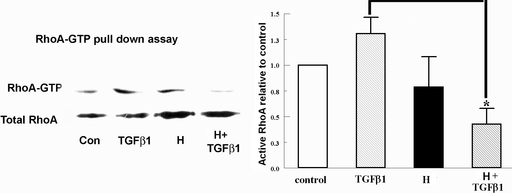 hypoxia (H) with or without 5 ng/ml TGFβ1 for 7 min. GTP bound RhoA was