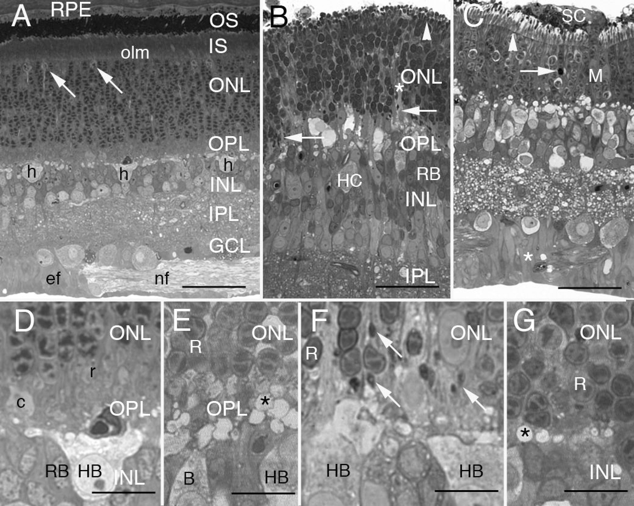 nuclei (R) separated by thickened Müller cell processes. Large,
