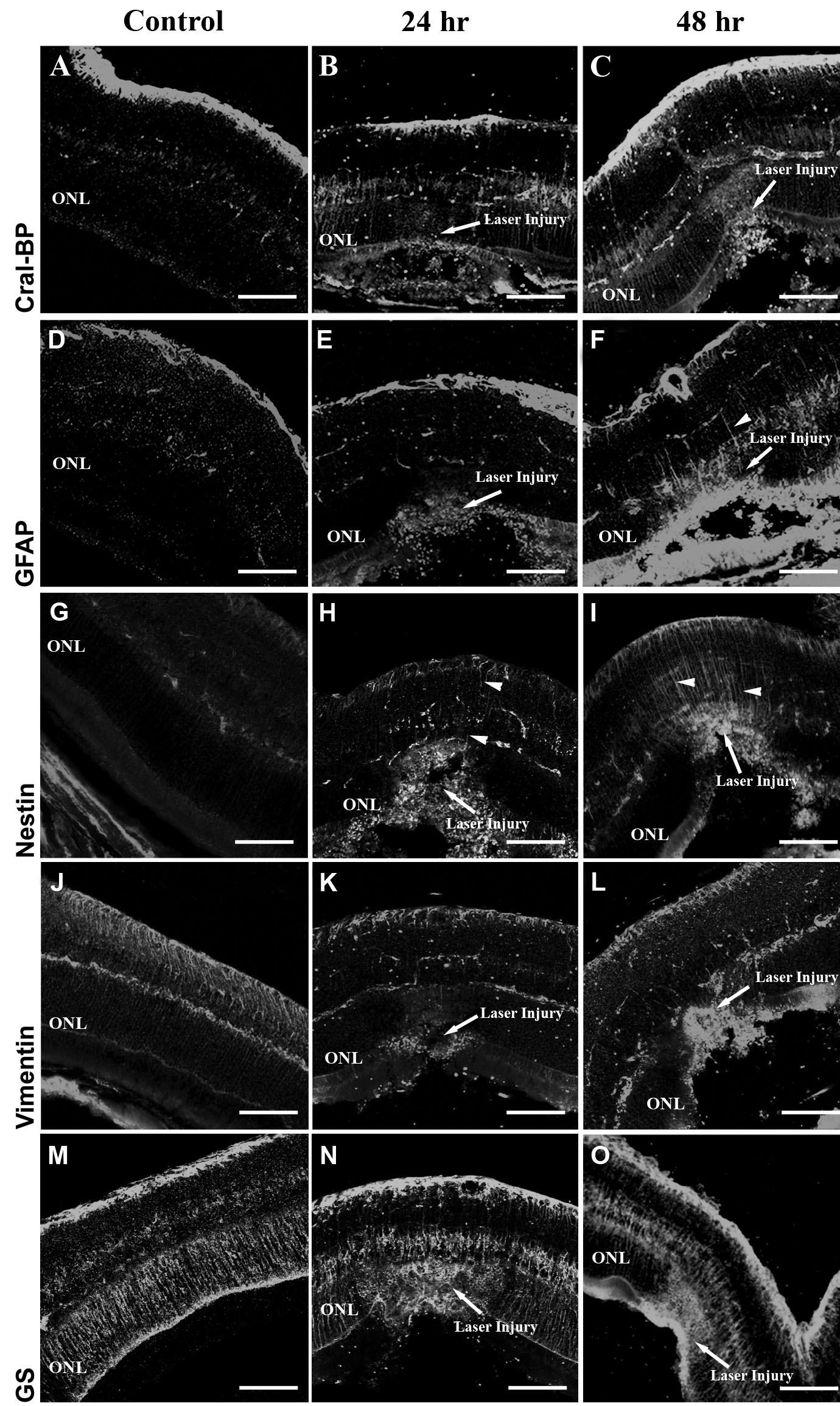 immunostained using the glial markers Cral-BP (A-C), GFAP (D-F), nestin (G-I), vimentin (J-L), and GS (M-O). Cral-BP was upregulated at 24 and 48 h within the injury site (A-C). GFAP was upregulated at 48 h postinjury (F). Nestin was upregulated at 24 h and 48 h (G-I) postinjury. Vimentin and GS did not show a significant increase in expression at any time point (J-O). The scale bar represents 75 μm. Abbreviation: outer nuclear layer (ONL). Arrowheads indicate Muller cell processes.