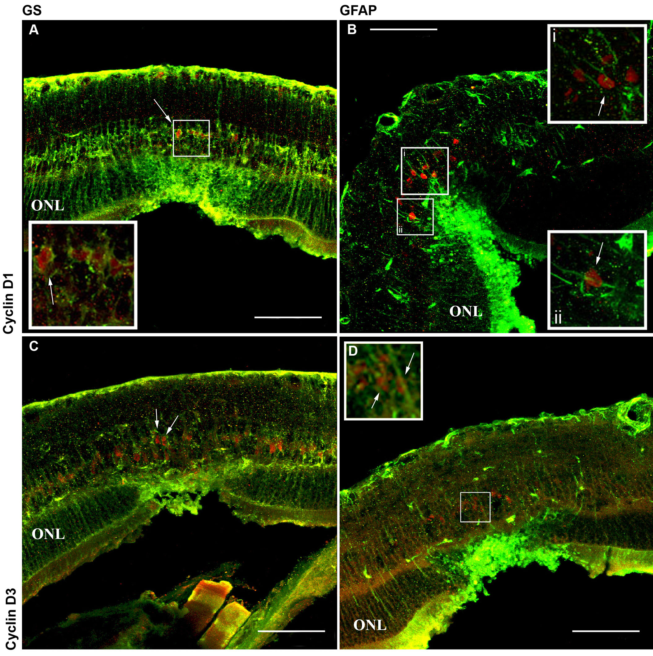 green), GFAP (B, D; green), Cyclin D1 (A, B;