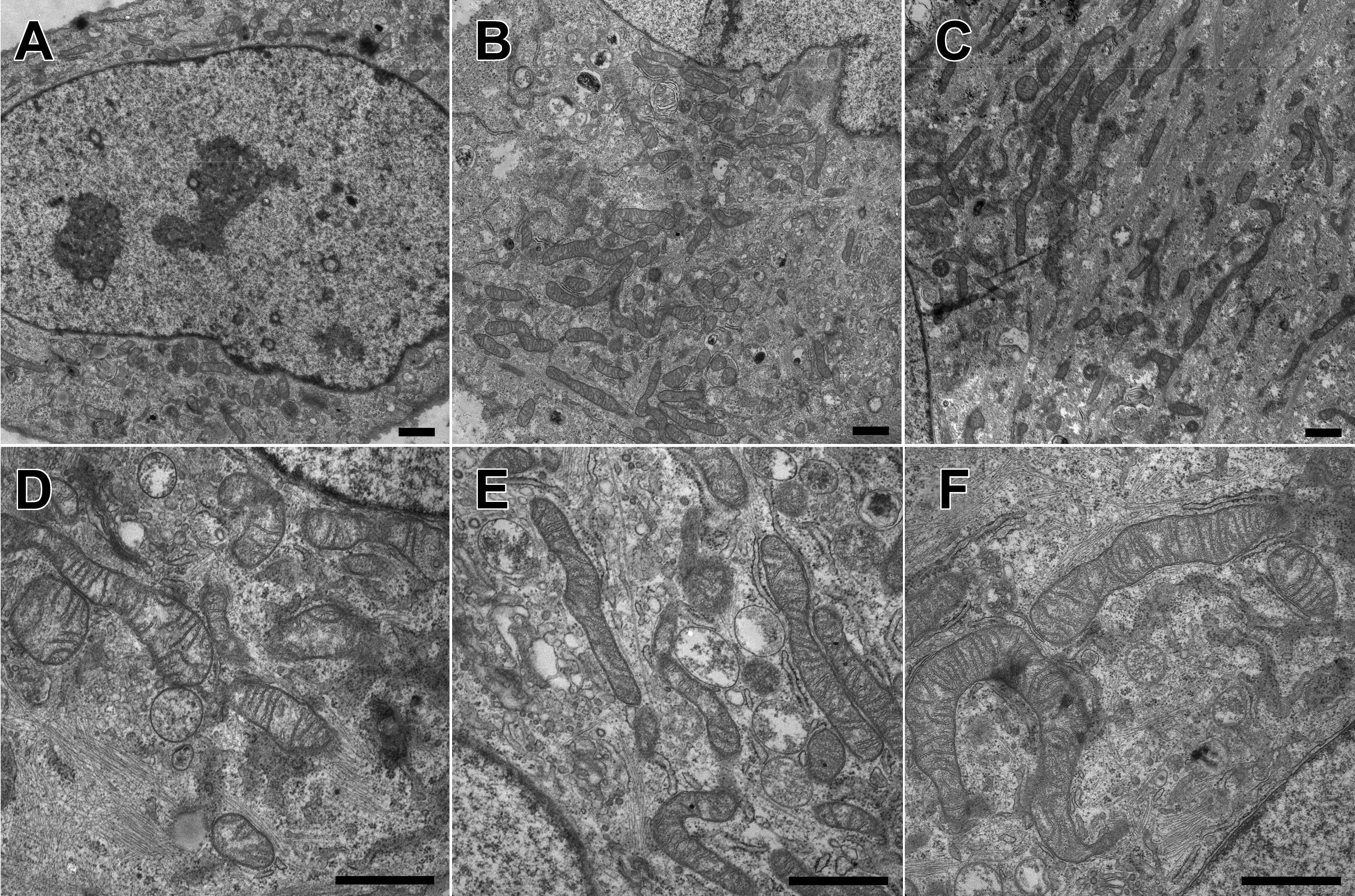 F) for 72 h (Bar=1 μm). Irradiated cells showed mitochondria with