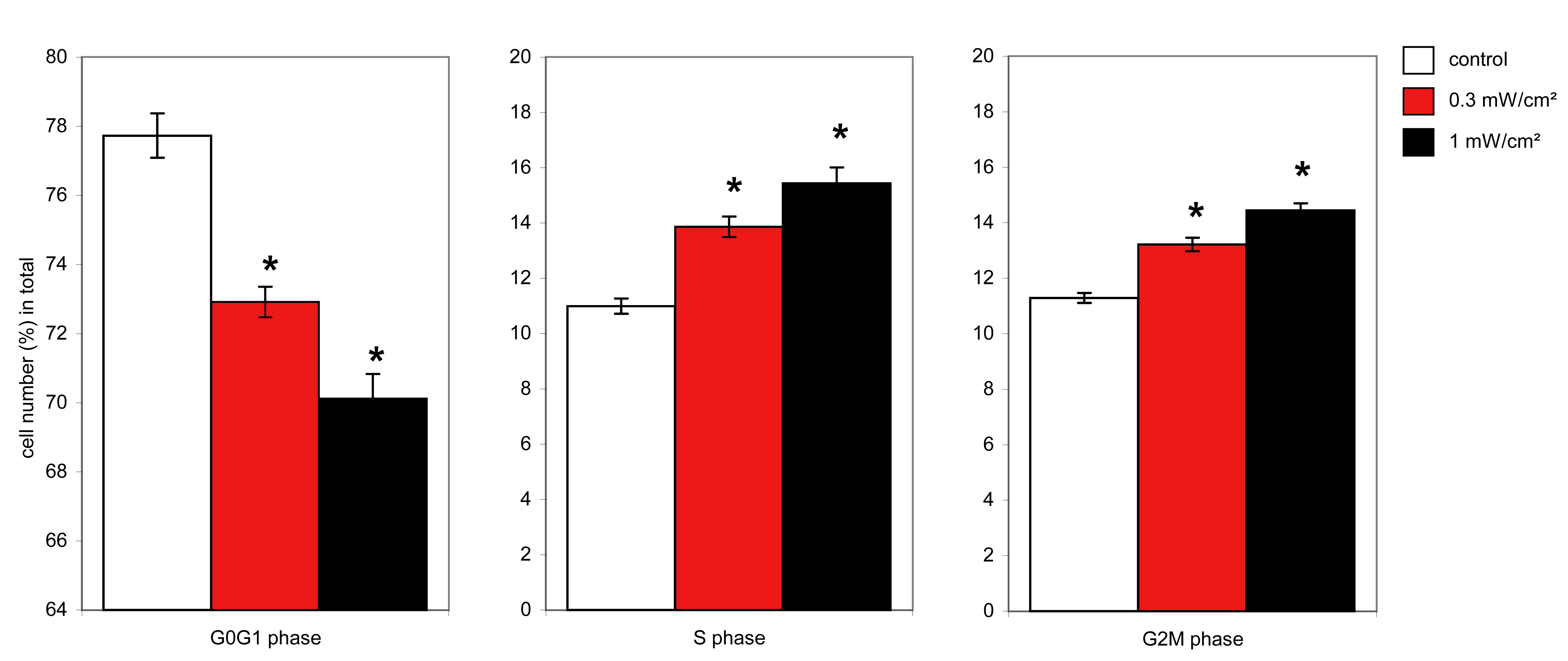control cells (white bars) versus cells irradiated at 0.3 mW/cm2