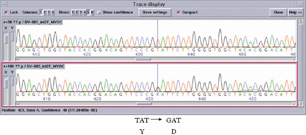 the myocilin mutation, Y371D (lower panel). Nucleotides and predicted amino acid changes are indicated under the electropherogram.