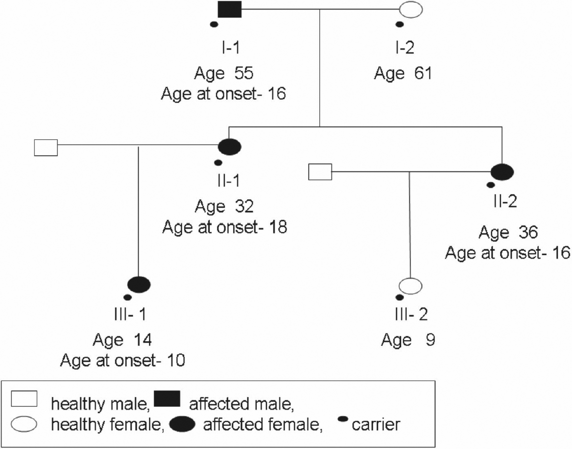 Table 1. Heterozygotic carriers of the mutation are depicted by a small black dot under their own respective sign.