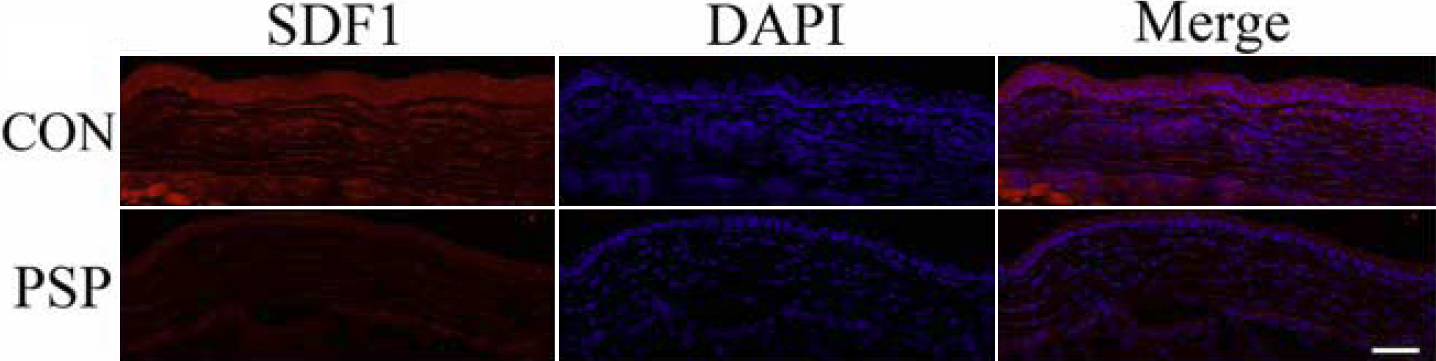 expressed in fibroblast in cornea. Topical PSP administration decreased the expression of SDF1 in cornea stroma effectively.