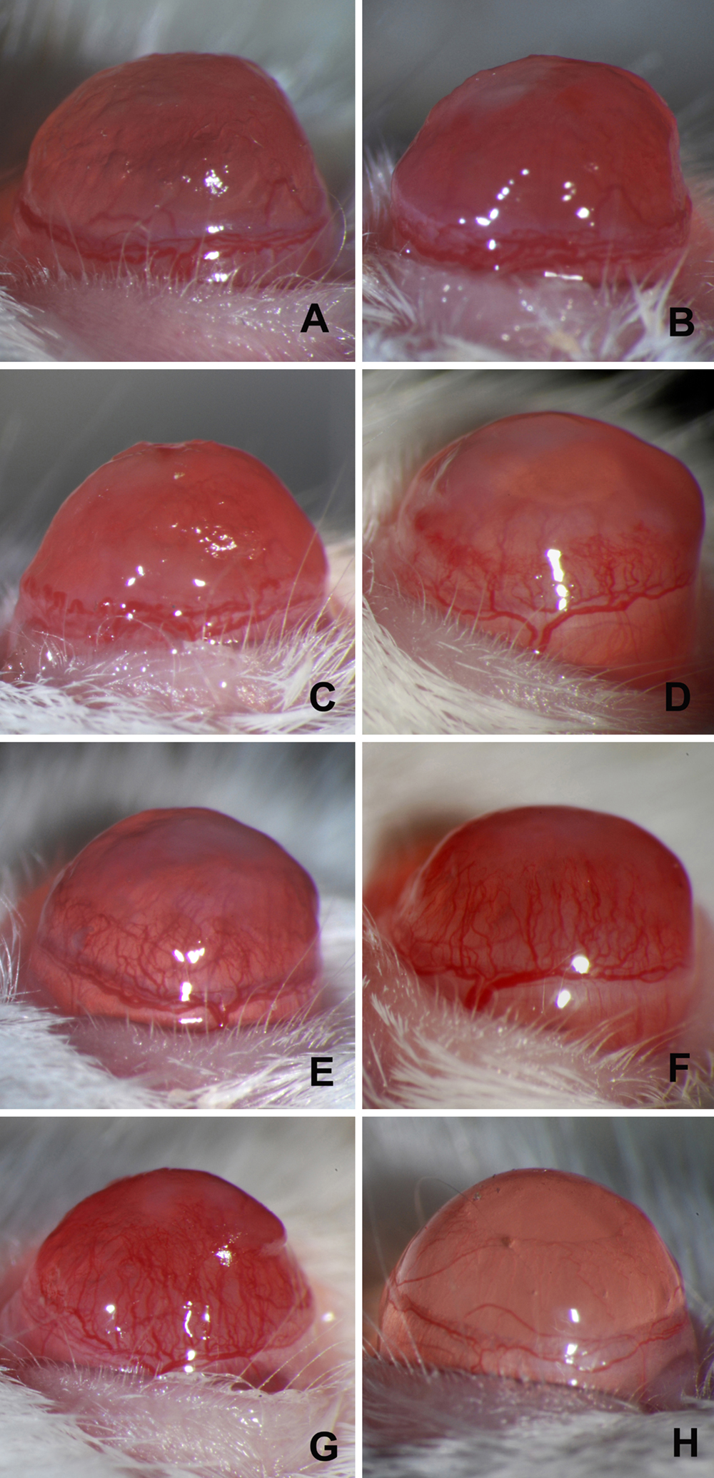 Figure 2. Corneal neovascularization during 7 days of follow up during murine C. albicans infection. Daily progression over one week of corneal neovascularization in mouse eyes with C. albicans keratitis (panels A to G from day 1 p.i. to day 7 p.i., respectively). No abnormal corneal blood vessels occurred in the mock-inoculated control (H).