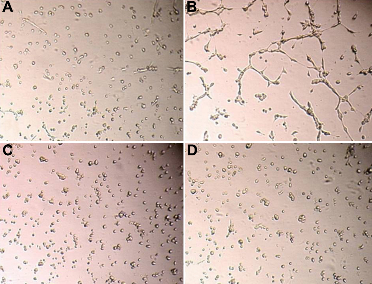 Figure 1. Network formation by corneal fibroblasts on Matrigel. Type-1(A) and type-2 (C) corneal fibroblasts were seeded on matrigel and photographed before incubation, representing time 0. The same plates were