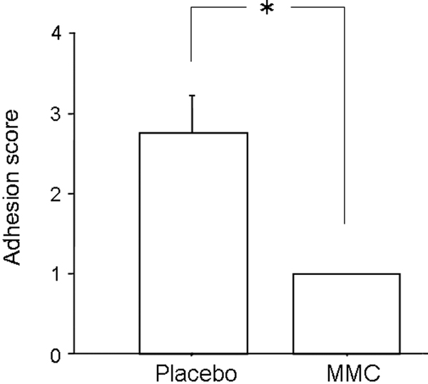 Scores of adhesion formation assessed three weeks after trabeculectomy in placebo- and mitomycin C (MMC)-treated eyes. Values are represented as means±SE. The asterisk indicates p<0.05 compared with placebo-treated eyes.