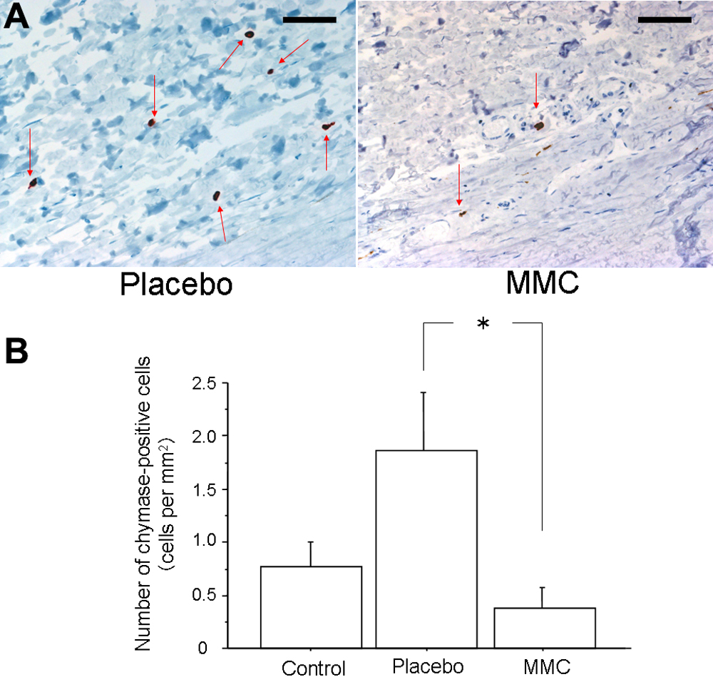 weeks after trabeculectomy. Bars represent 100 μm. Arrows demonstrate positive cells. B: The numbers of chymase-positive cells per mm2 in control, placebo- and MMC-treated eyes are shown. Values are represented as means±SE. The asterisk indicates p<0.05 compared
