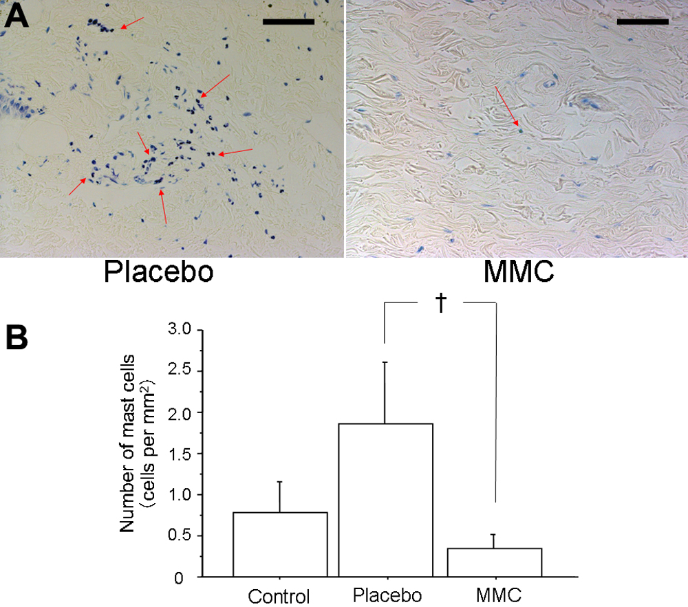 after trabeculectomy. Bars represent 100 μm. Arrows demonstrate positive cells. B: The numbers of mast cells per mm2 in control, placebo- and MMC-treated eyes are shown. Values are represented as means±SE. The symbol (†) indicates p<0.2 compared