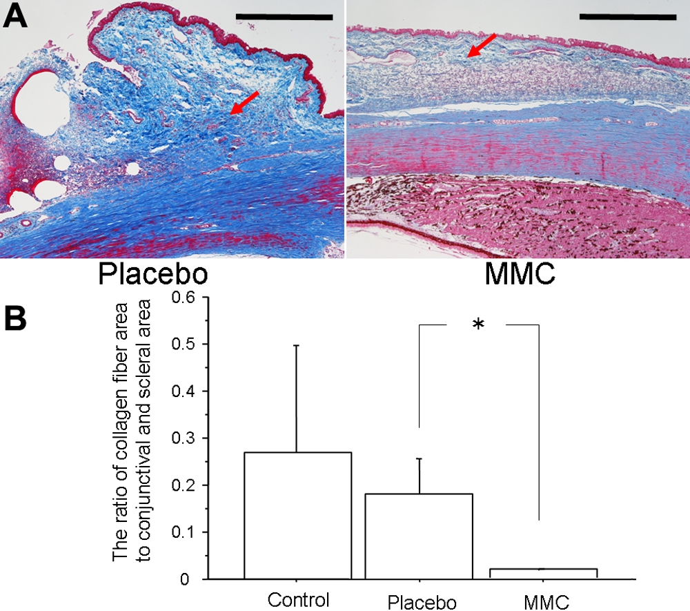 Bars represent 500 μm. Arrows demonstrate collagen fibers. B: The ratios of collagen fiber areas to conjunctival and scleral lesions in control, placebo and MMC-treated eyes are shown.