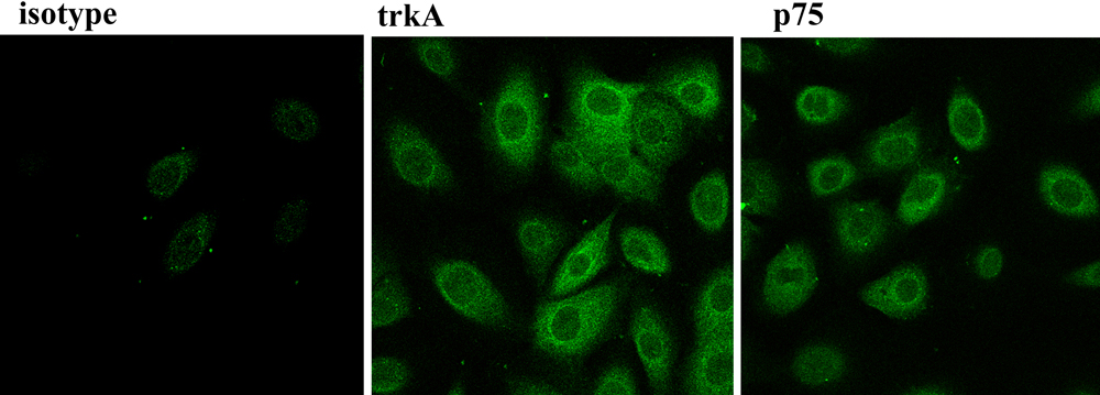Figure 2. TrkANGFR/p75NTR protein expression in primary untouched VKC conjunctival epithelial cells (VKC-ECs). Confocal analysis specific for trkANGFR (middle) and p75NTR (right) in VKC-ECs. Control-isotype signal (left) was used in channel series acquisitions, and identical acquisition settings