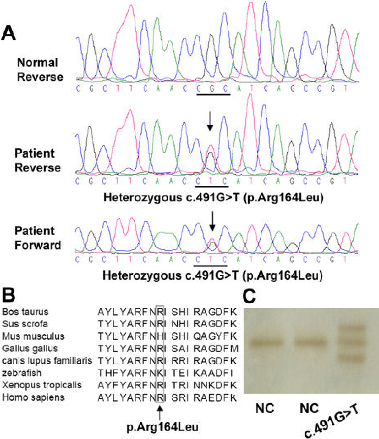 (c.491G>T; indicated by an arrow) changed a highly conserved residue