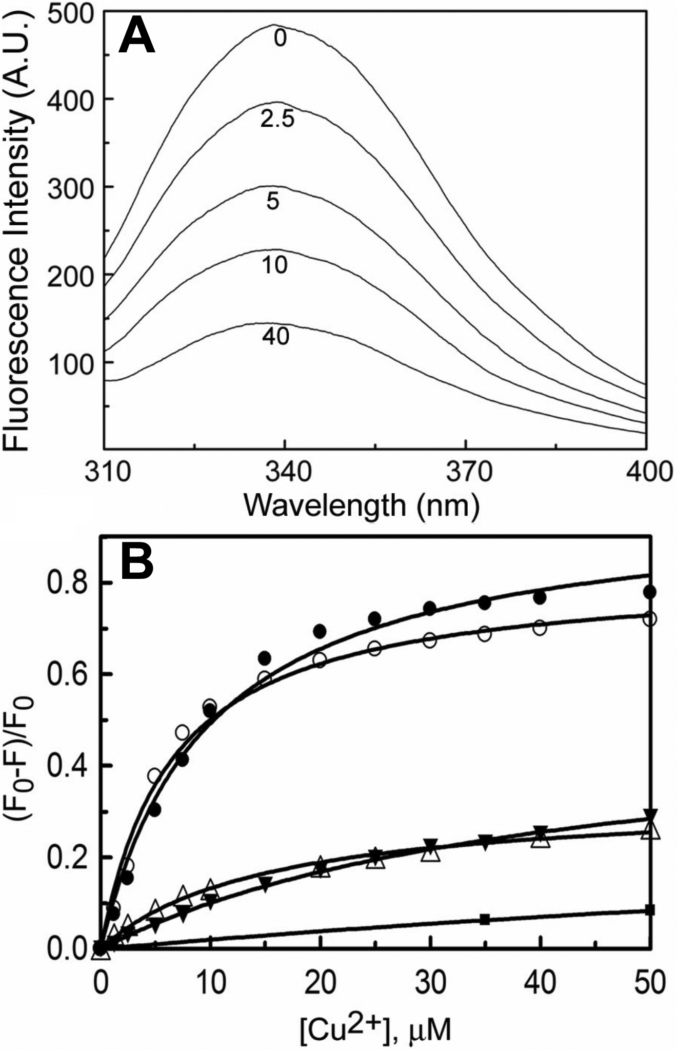 fluorescence intensities at 337 nm in the absence and in the presence Cu2+.
