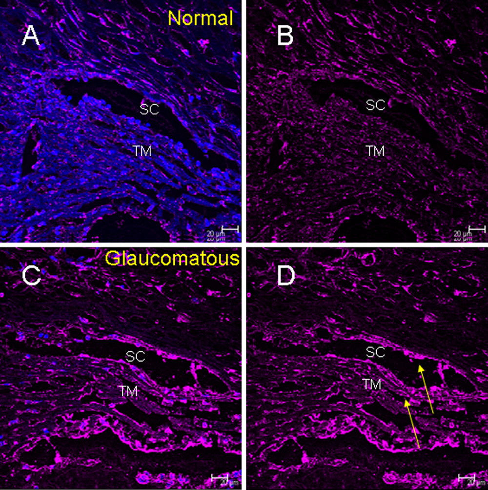 compared to normal TM as in A. D:Glaucomatous TM labeled by ETX1 antibody coupled to Cy5, with arrows indicating areas of hyperfluorescence compared to normal